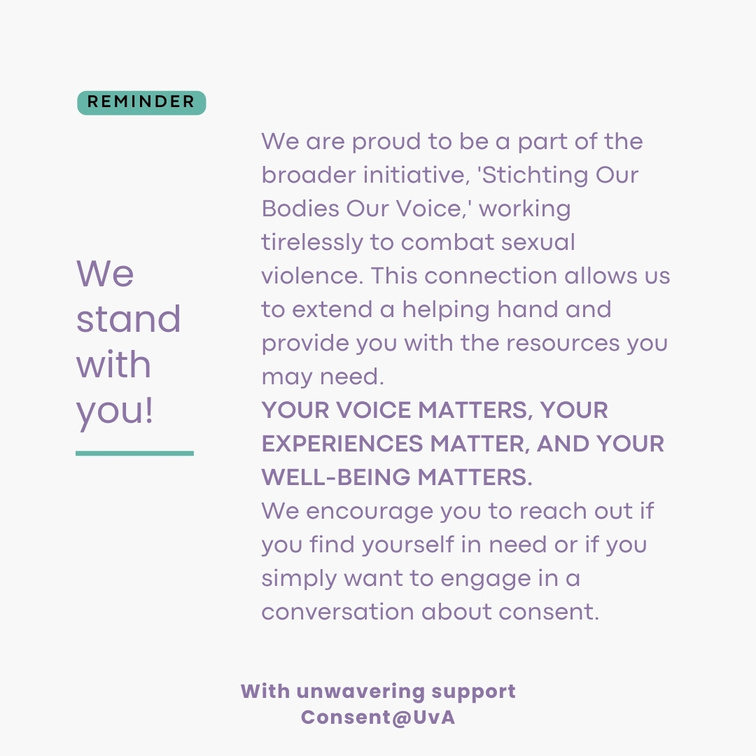 My work with Consent At UvA. A Branch at UvA Under Stitching Our Bodies Our Voice Non-profit Organisation. OBOV fights against sexual violence by helping and spreading awareness within students at schools and universities and hosts plenty of events throughout the year in The Netherlands for it.